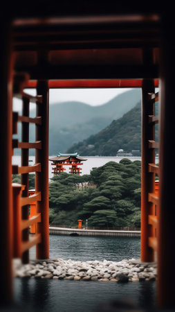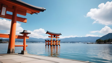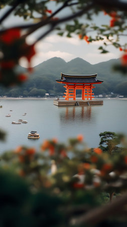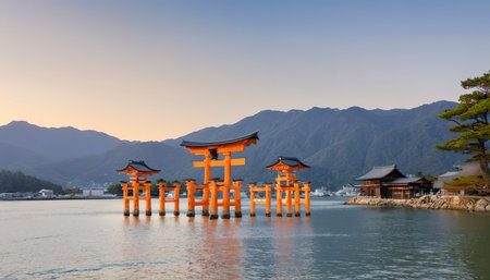 The sacred Itsukushima Shrine with its floating red torii gate overlooks the calm waters and mountains of Miyajima island in Japan