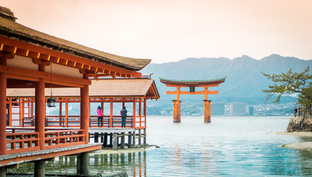 Hiroshima, Japan - March 16, 2016: Tourists are taking picture of Miyajima Torii from the corridor of the floating temple.