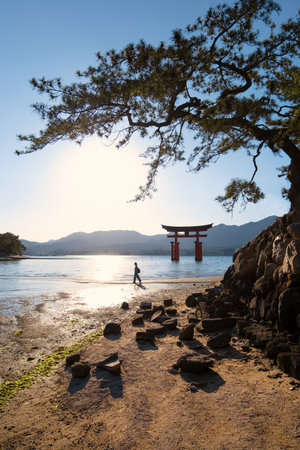 Miyajima, Japan - December 28, 2009: Floating Torii Gate of Itsukushima Shrine of the coast of Miyajima Island.