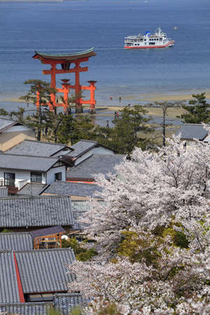 MIYAJIMA, JAPAN - CIRCA APR, 2013: Tourist boat passes near red wooden sacred torii gate at sea high tide. The Miyajima Island (Itsukushima), Japan