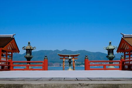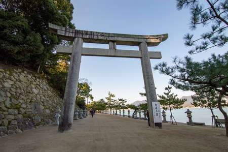 Hiroshima Prefecture / Japan - December 21, 2017: Entrance torii gate to the Itsukushima Shinto Shrine on the island of Itsukushima Miyajima, UNESCO World Heritage Site