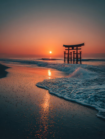 A beautiful sunset illuminates a serene torii gate on a quiet beach. Gentle waves reflect the warm colors of dusk, creating a tranquil scene perfect for relaxation and contemplation.