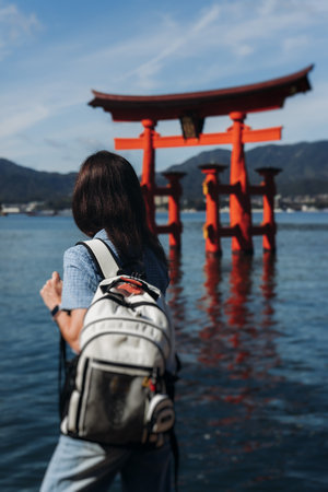 a silhouette of a woman in front of the torii of miyajima. Close to hiroshima