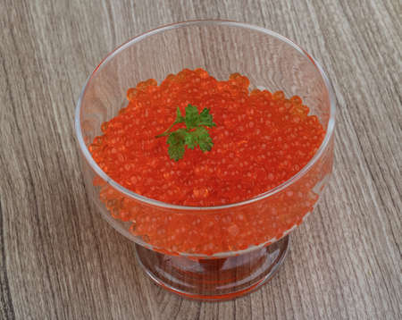 Red caviar in a bowl with wooden spoon on a wooden table.Japanese fierce salmon egg dishes