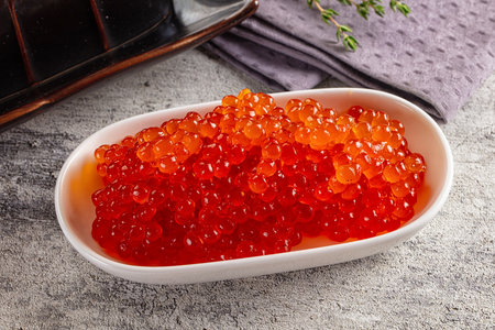 Red caviar in a plate close up. Salmon caviar texture over gray background. Delicious gourmet food. Delicatessen. Texture of caviar. Seafood, macro shot.