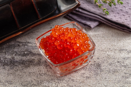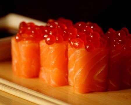 Salmon eggs or Ikura in Japanese style sushi fresh from raw salmond fish in studio lighting.