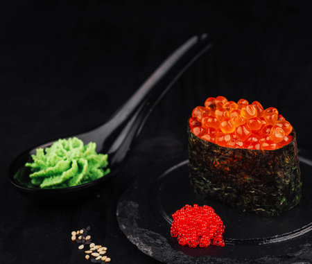 Gunkan maki with red caviar is served on a black stone plate with wasabi and sesame seeds