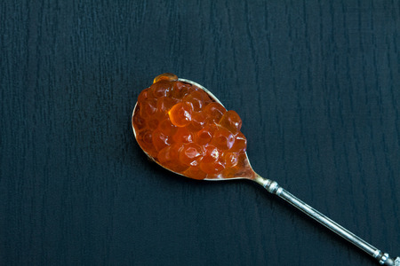Closeup of spoon with red caviar on a background. appetizer seafood