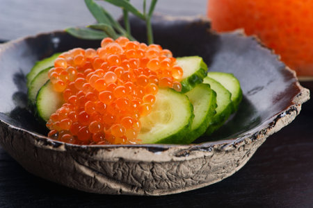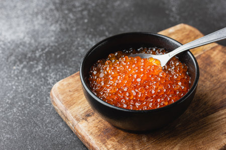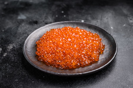 Top view of red caviar in bowl, salmon caviar on black stone background with copy space, seafood delicatessen