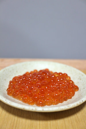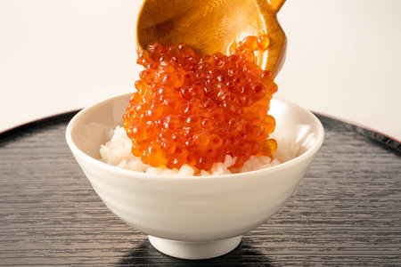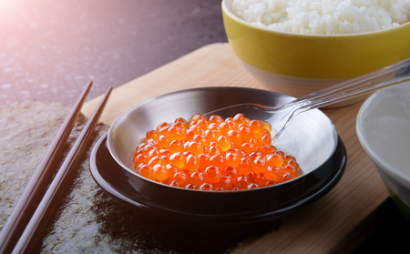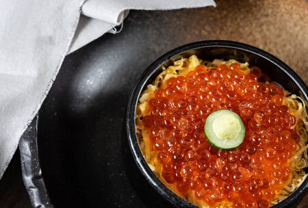 Salmon eggs or Ikura in Japanese style with rice fresh from raw salmond fish in studio lighting with space for text.