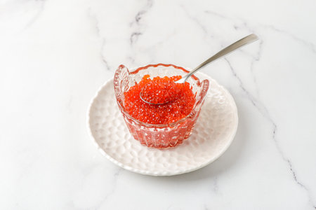 Red caviar on a spoon and in a glass on a white painted wooden table, festive seafood snack for holidays, copy space, selected focus, narrow depth of field
