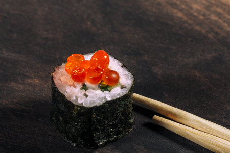 sushi roll with red caviar on the dark wooden background, eating sushi roll in restaurant, selective focus. Close up.