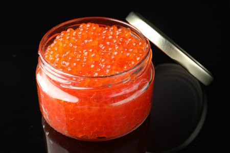 Delicious red caviar in a glass jar on crushed ice on black stone background, selective focus