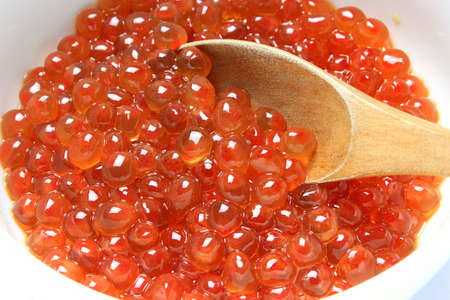 fresh grainy red chum salmon caviar in a wooden spoon, delicious and healthy food, close up