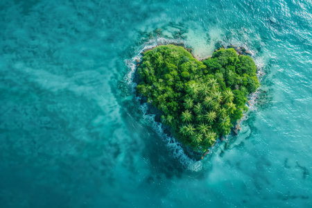 Heart shaped tropical island in the middle of a clear blue ocean. a celebration of the feast of Saint Valentine. Massive tropical island with a heart shape in the water, as seen from above. All that i. Generative AI