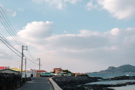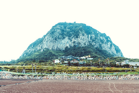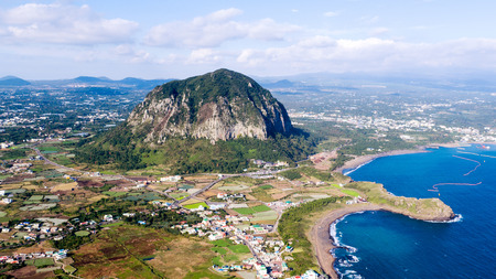 JEJU ISLAND, SOUTH KOREA - AUGUST 18, 2015: Small town located by the sea shore with big turtle shaped mountain right behind it - Jeju Island, South Korea