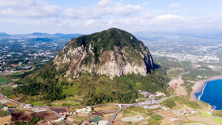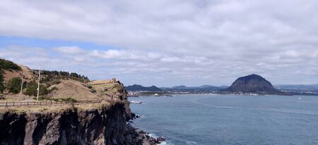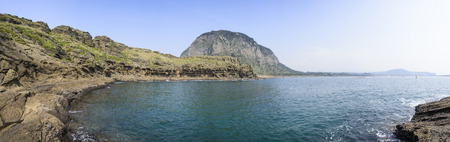 Landscape view of songaksan and Sanbang-san mountain separated by ocean in Jeju Island, South Korea