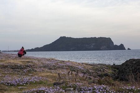 Tourist takes pictures on the shallows Jeju Do Seongsan Ilchulbong, Jeju Island, South Korea