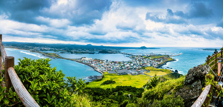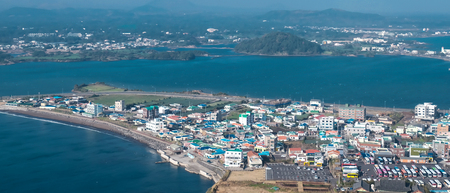 Panoramic view of seaside village from Seongsan Ilchulbong Tuff Cone in Jeju Island, Korea