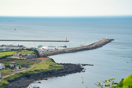 Jeju island, South Korea - Jun. 04, 2023: Beautiful seongsan port at Jeju do (Jeju island), view from top of Seongsan Ilchulbong, sunrise peak.