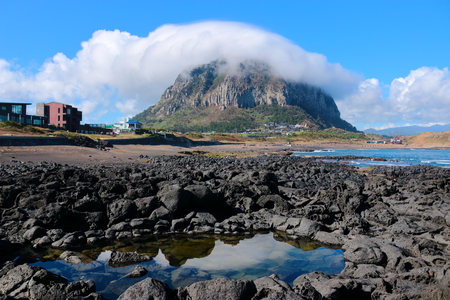 Black sand and seashore of Sunrise Peak, Jeju island, South Korea, one of the nature tourism site in Korea