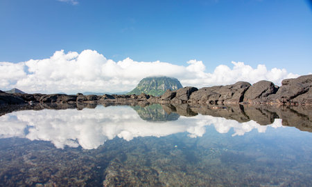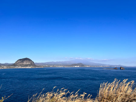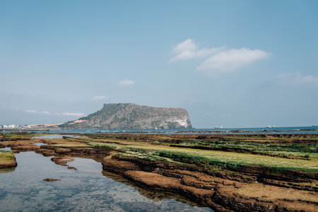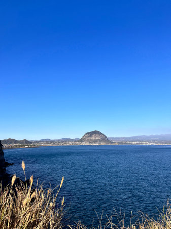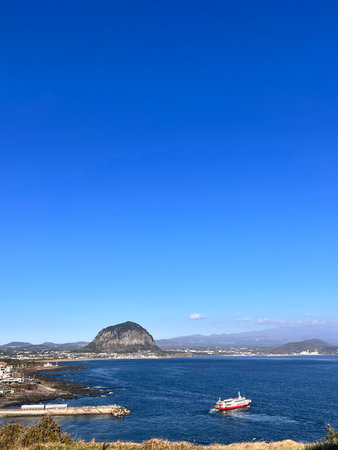 landscape view of Sanbang-san mountain seen from across the bright blue ocean in Jeju Island, South Korea
