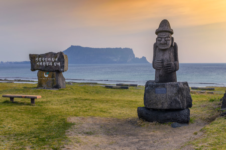 Dol hareubang statue and Jeju-do Seongsan Ilchulbong, Jeju Island, South Korea