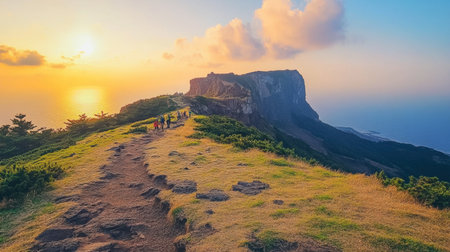 The scenic beauty of the Jeju Seongsan Sunrise Peak, with hikers enjoying the early morning view.