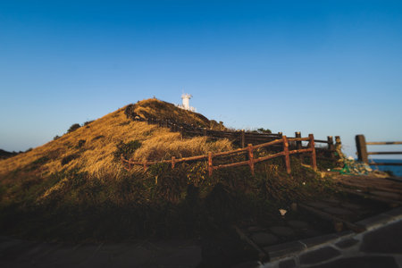 Jeju-do, Seopjikoji cape landscape with lighthouse and sea, east coast of Jeju Island, South Korea, Seongsan-ri, Seogwipo, Jeju Province view in a sunny day, with sea and cliffs