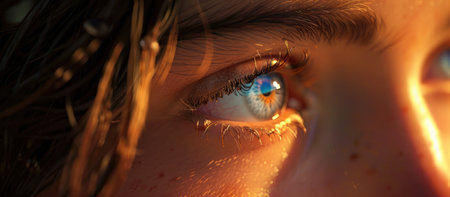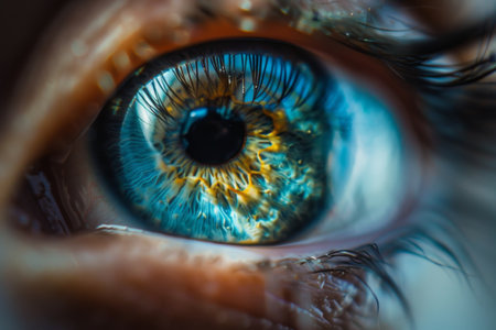 Captivating close-up of a human eye featuring a stunning blue iris, long lashes, and a natural brow, illuminated by soft light that enhances the intricate details of the eye and its expression.