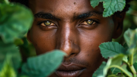 Focused close-up portrait of a young Ethiopian male farmer with an intense expression amidst green foliage