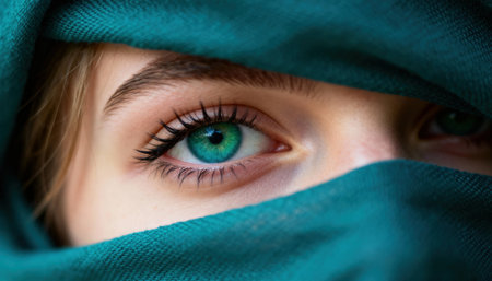 Woman with teal scarf frames a close-up of a single green eye with soft directional lighting and shallow depth of field, creating an intimate portrait and available space on the left for text or design elements