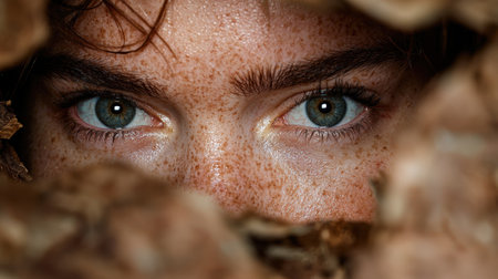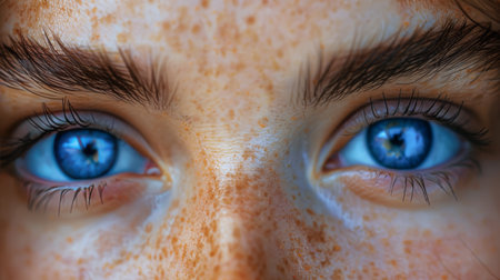 A young person displays their captivating blue eyes which shine brightly in soft natural light. Freckles dot their skin adding to the uniqueness of their appearance.