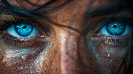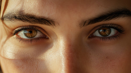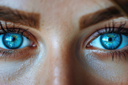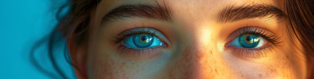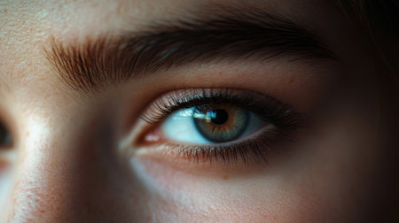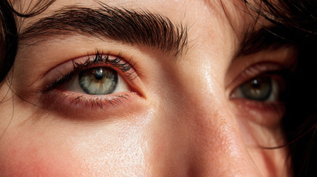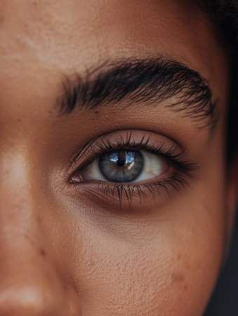 Close up view of person eyes, showcasing striking blue irises and well defined eyebrows. skin appears smooth and radiant, highlighting natural beauty and detail of eyes