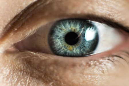 Close up of a woman's blue eye. Selective focus.