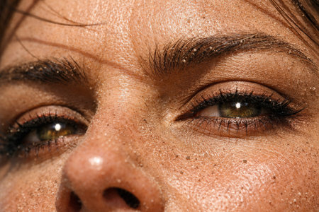 Close-Up of Woman's Face with Sand on Skin and Green Eyes