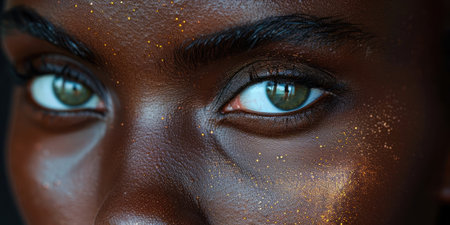 A close-up shot of sparkly eye makeup on dark skin, emphasizing the intricate details and vibrant colors.