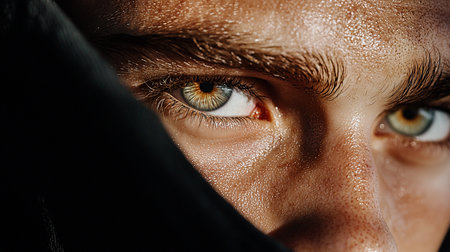 A dramatic close-up captures a man's face, glistening with sweat, with intense hazel eyes. The dark fabric adds contrast, emphasizing the raw emotion and physical exertion.