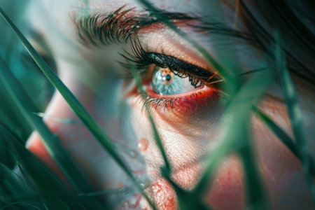 A woman's eye is open and staring into the distance. The grass around her is green and lush, creating a peaceful and serene atmosphere