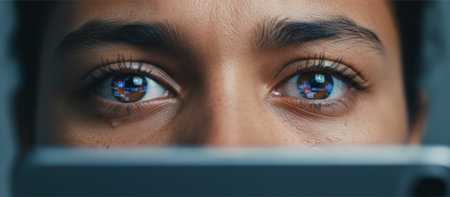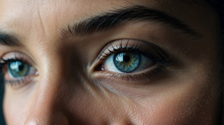 A close-up of a woman's face focusing on her eye, showing the details of her eyelashes and the unique patterns in her iris