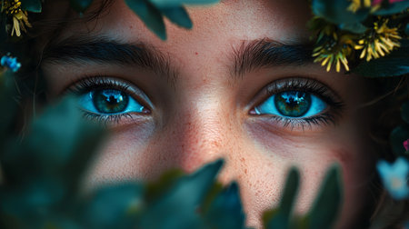 A close-up of a person's vibrant blue eyes surrounded by leaves and greenery, symbolizing a connection with nature, beauty, and human expression.
