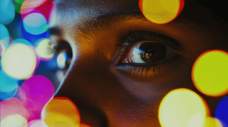 Woman s Eye with Christmas Lights Reflection Festive Season Glow and Wonder in Close-Up