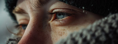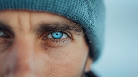 A man gazes intently, showcasing striking blue eyes against a snowy backdrop. He wears a knitted beanie, highlighting the contrast between warm atmosphere and the cold environment.