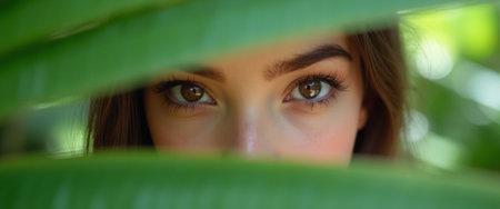 A close-up of a womans eyes as she peers through large green leaves in a natural setting. The vibrant green foliage contrasts with her expressive eyes, creating a mysterious atmosphere.