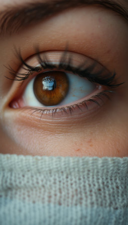 This striking close-up showcases a mesmerizing brown eye, framed by long lashes and partially covered by a soft, textured fabric. The reflection in the eye adds depth and intrigue, inviting viewers to explore the emotions and stories behind this intimate gaze.