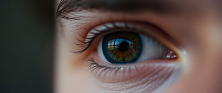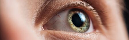 close up view of human green clear eye looking away, panoramic shot