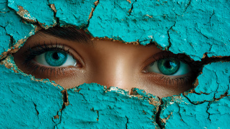 An enigmatic stare pierces through a fractured surface, with striking turquoise eyes illuminating a sense of secrets behind the fragmented barrier.