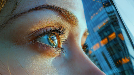 Close-up shot of a womans eye reflecting a cityscape in the background