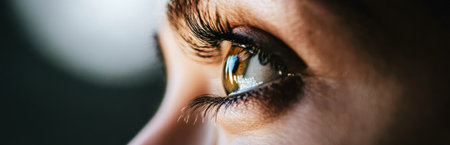A close-up of beautifully contoured eyes, with perfectly applied mascara and eyeliner, highlighting the intensity and elegance of the woman's natural beauty.
