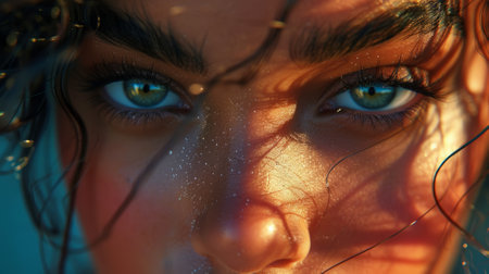 A stunning close-up reveals a woman's enchanting blue eyes and radiant skin illuminated by soft, natural light, highlighting her beauty.